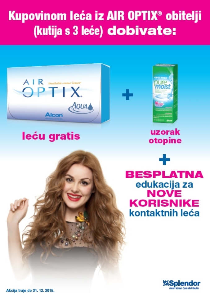 Bilo da već nosite kontaktne leće ili se tek spremate početi ih nositi, sada je pravo vrijeme da navratite u naše optike. Uz svaku kupnju jedne kutijice kontaktnih leća AirOptix (3kom) na poklon dobivate još jednu leću gratis. A ako ste još uvijek u nedoumici ili strahu od nošenja kontaktnih leća, rezervirajte svoj termin za besplatnu edukaciju za nove korisnike nakon koje će vam sigurno biti lakše donijeti odluku.