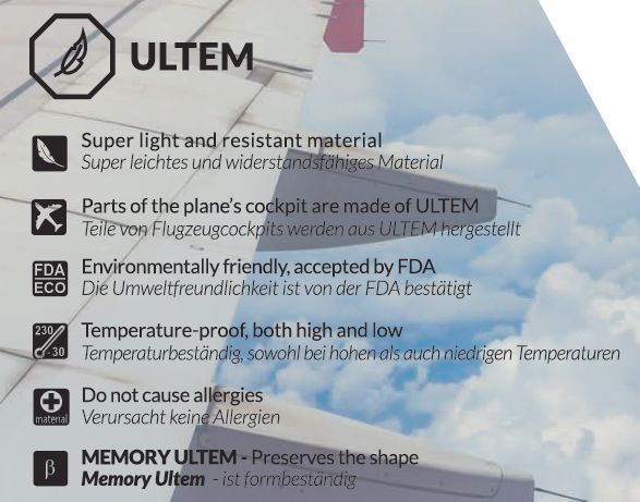 Solano je prvi brend koji je proizveo clip on naočale od ovog materijala i do dan danas unapređuju njihov izgled i kvalitetu. ULTEM je savitljivi i visoko izdržljivi materijal koji se danas koristi i u avio industriji. Otporan je na visoke i niske temperature te izuzetno lagan. Također, vrijedno je istaknuti da je materijal antialergijski i ekološki prihvatljiv.