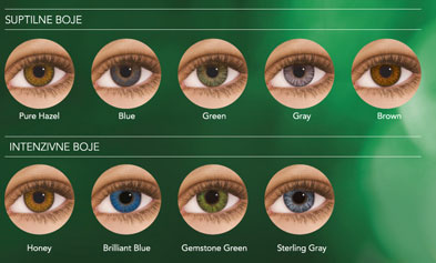 NOVO! Air optix Colors. Kontaktne leće u boji s visokom propusnošću kisika. Imaju isti 3 u 1 dizajn kao i FreshLook® ColorBlends za što prirodniji izgled šarenice. S paletom od 9 razližitih boja nude promjenu boje oka, bez obzira imate li svijetle ili tamne oči.